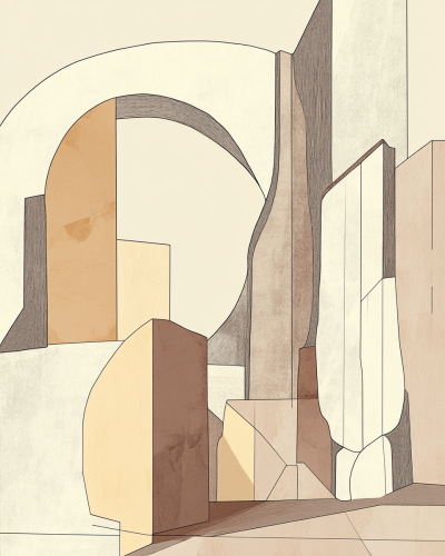 A bold minimalistic abstract illustration featuring strong, angular lines and geometric shapes in a muted color palette. The sharp contrasts between lines and shapes add depth and structure, creating a striking yet simple composition. --style raw --ar 4:5