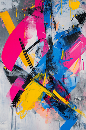 Design an abstract piece that represents the city during a rainstorm. Use flowing, organic shapes to mimic rain falling on busy streets and reflecting off windows. The color palette should be muted, with shades of gray, slate blue, and hints of silver. Add small pops of color, like bright red and yellow, to symbolize city lights glowing through the rain. The overall impression should be moody yet calming, capturing the rhythm of rain on an urban landscape --ar 2:3