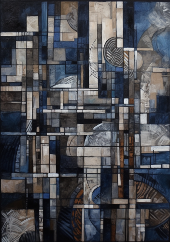 Abstract painting of geometric shapes in dark blue, black, and beige colors, with white lines on the edges of each shape, in an elegant wooden frame. The composition is a seamless blend of bold and soft tones, creating depth that enhances its modern artistry. --ar 45:64 --v 5.0 --s 750