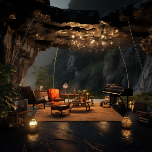 AI, create an image set inside a cave during a rainstorm. The cave provides shelter from the heavy rain outside. Include details such as two bamboo fire lantern holders, a rock firepit with flames, and an L-shaped couch. Place a table with a record player, and ensure the atmosphere reflects the coziness of the cave amid the sound of raindrops. Emphasize the contrast between the sheltered interior and the stormy weather outside