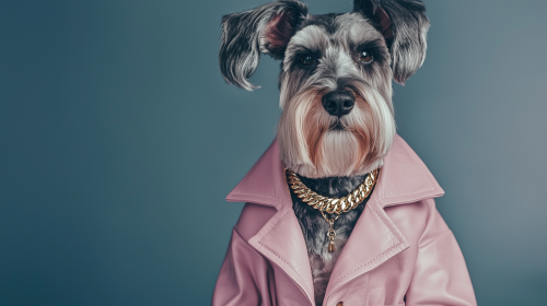 A full-body shot of a long-haired Schnauzer dog wearing a stylish pink leather coat and a gold necklace, captured in a realistic photo. The Schnauzer's detailed, textured fur flows beautifully, and the outfit adds a unique, fashionable touch. The background is simple to keep the focus on the dog, showcasing the elegant coat and necklace details. High-resolution image with natural lighting for a vibrant, lifelike look --ar 16:9 --q 2