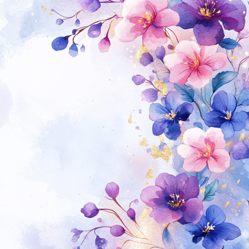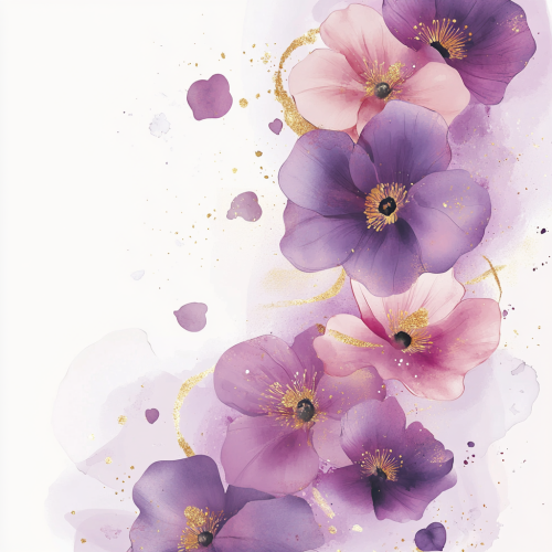 Create a design with beautiful flowers scattered around the edges of the artboard, using a gradient of purple and pink. Include some gold accents and give the design a spiritual, sparkling feel. A watercolor-style design is preferred.