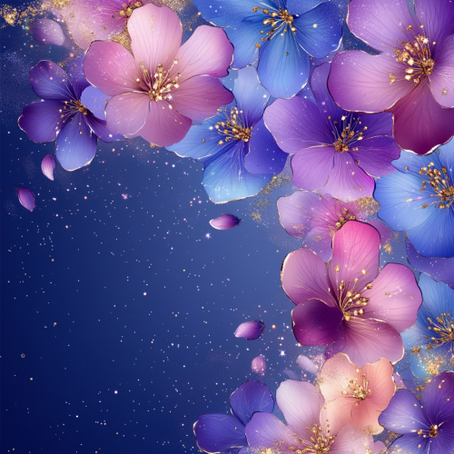 Create a design with delicate and beautiful flowers scattered around the edges of the artboard, using a gradient of purple, pink, and blue. Include hints of gold, and make the design feel spiritual with a sparkling effect.