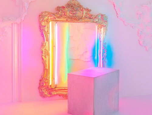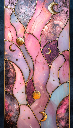 vaporwave sun and moon among white mother of pearl and bright shiny pink like a tropical beach and gold wavy pattern iridescent opal stained glass kintsugi with gold fillings and some stars, with tiny gold stars and pink cherry blossoms --ar 4:7 --stylize 250 --v 6.1