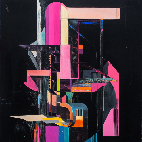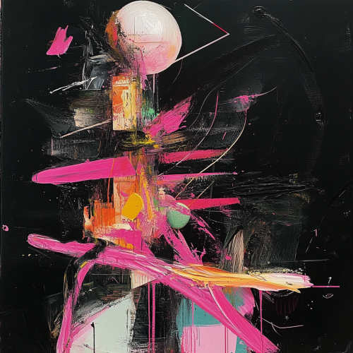 Hyperreal, abstract, surrealist painting, black background, gestural image painted with thick pink brush strokes, Francis Bacon atmosphere, modern style, with colorful design graphic forms, different material surfaces, geometric and natural elements in a tower-like composition.