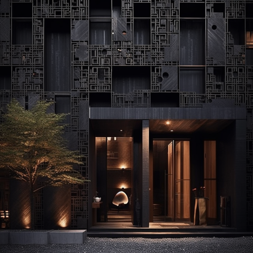 an hotel building made from black wood, in the style of texture-rich surfaces, in japan, subtle, earthy tones, metallic surfaces, soft, atmospheric lighting, stripes and shapes, burned/charred,