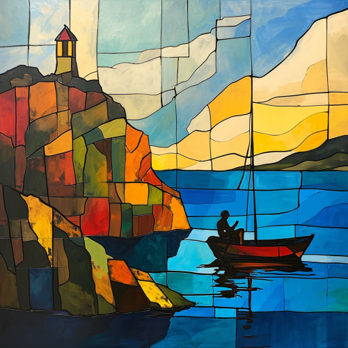seascape with fisherman on an island in the style of mondrian --v 6.0