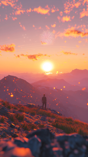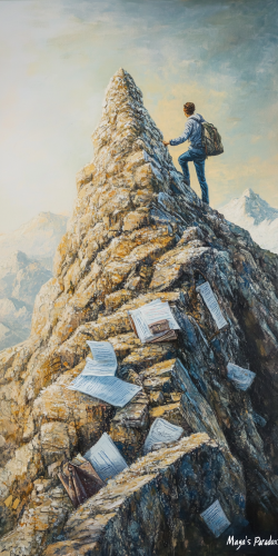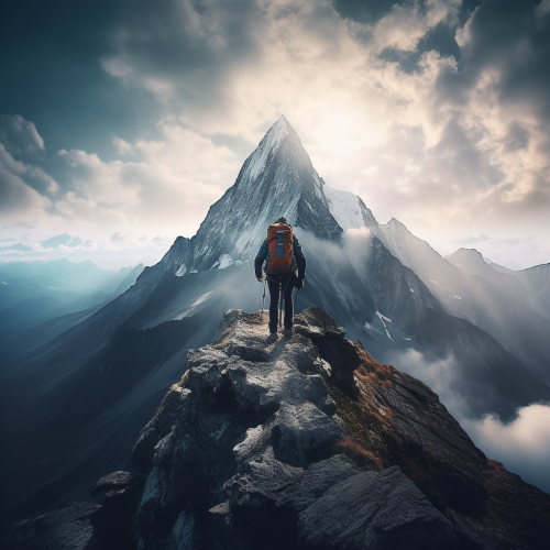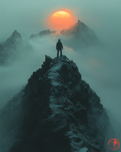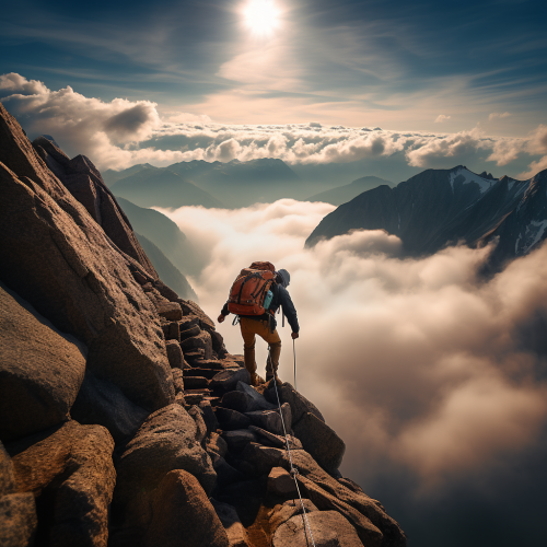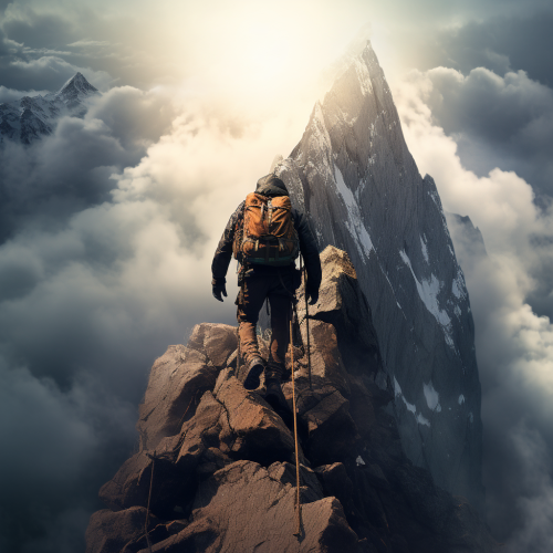 A person is climbing a mountain, halfway up, with a breathtaking view of the horizon in the distance. Below, there's a foggy, uncertain landscape representing past struggles and doubts. The person is determined, looking up toward the summit, where the sun is breaking through the clouds, symbolizing growth, progress, and hope. The scene captures the journey of self-improvement and perseverance. --ar 4:5 --s 750