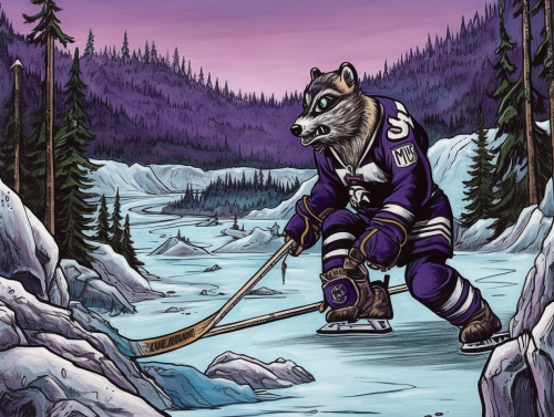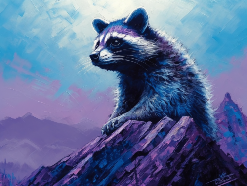 a blue-furred raccoon planting a hockey at the summit of a purple mountain, painted in the style of Branko Marjanovic, detailed, expressive, HD, --ar 4:3 --s 750 --v 5.0