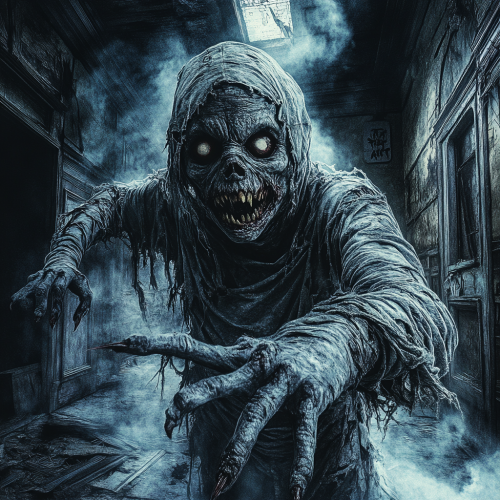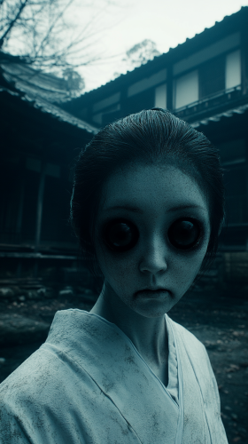 Ancient Japanese woman with dark round hollow eyes. The woman is cursed. The woman has a distinctly foreign and eerie face. The woman is wearing a white kimono. The background is an old mansion in ancient Japan, dark and haunted. The area is dark and full of fear. The atmosphere is gloomy and eerie. A photographic representation of reality. --no illustration, painting, --style raw --ar 9:16 --v 6.1