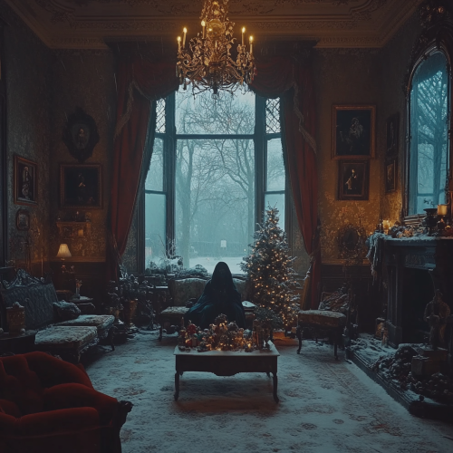 A Victorian London living room in a haunted mansion. The room is decorated for Christmas but there is still a creepy feel to the room. Outside a large window a snowstorm is seen. In the room a hooded sinister version of St. Nicholas lurks. The time of day is night. Moody and atmospheric. Horror movie feel. 4K