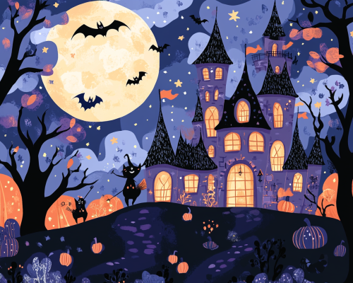 A playful and whimsical Halloween scene featuring a charming, slightly spooky haunted mansion with crooked towers and glowing windows. Friendly witches fly joyfully on broomsticks under a bright, full moon in a starry sky. Cute black cats with big, curious eyes sit on pumpkins, while smiling bats flutter around. The scene is filled with soft, glowing colors and magical sparkles, with twisty trees and fluffy clouds adding a magical, light-hearted touch to the dark night. The overall mood is spooky but fun, perfect for kids --ar 5:4 --v 6.1