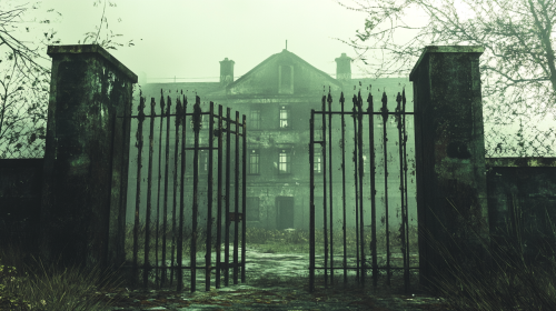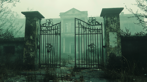 An eerie, abandoned hospital looms behind a rusted iron gate, its decayed facade barely visible through thick mist. The green-tinted scene has an old cinematic feel, with grainy texture, faded colors, and scratches along the edges, as though captured on an old, damaged film reel. Dusty film artifacts float across the image, giving a sense of age and decay. The sky is overcast, with shadows creeping around corners, amplifying the sinister atmosphere, keep it in oil brush style, painting, moody --ar 16:9