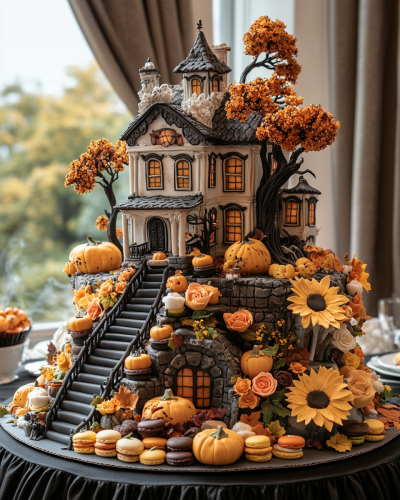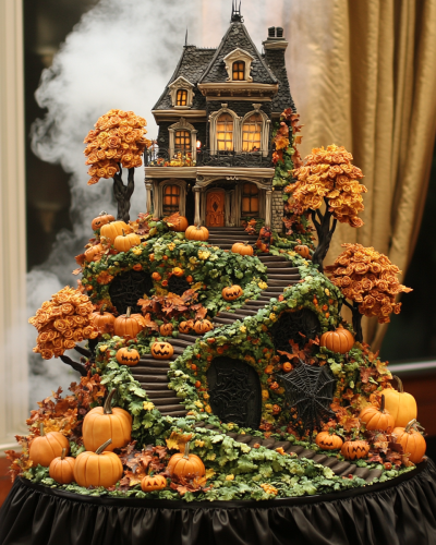 Create a very tall multi tiered novelty cake of a haunted Victorian Mansion on a hill. Spooky trees. A staircase case that leads up to the mansion. Pumpkins and Ivy and fall leaves and sunflowers. Roses in orange and burgundy red and yellow. There are Bright Halloween Themed cupcakes and macarons neatly placed around the base of this cake design. This cake is displayed on a dessert table that has layers of ruffled black satin tablecloth. There is a special effect fog smoke machine creating swirls of smoke around The base of the cake. The background has curtains. This room is a ballroom with guest tables decorated for a fun and elegant Halloween Ball. --ar 4:5 --v 6.1 --stylize 300