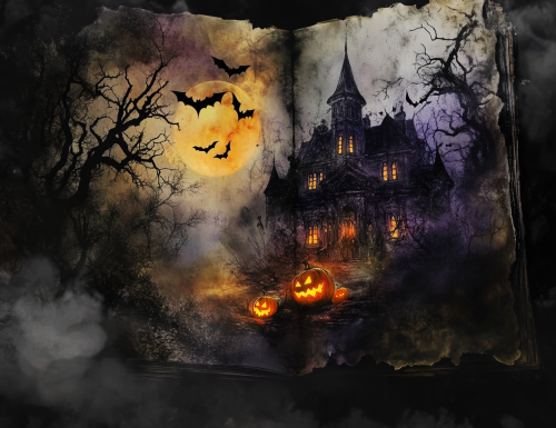 create a halloween themed Scrapbook .Some adventurers, medieval style, cautiously approach a haunted mansion with dimly lit windows.Dark, misty forest under a full moon, eerie twisted trees, glowing jack-o'-lanterns on the ground. In the foreground, Bats flying around the moon, black, orange, and purple colors creating a spooky atmosphere. Highly detailed, atmospheric, cinematic lighting, dynamic compositionpaper vintage antique page, watercolor, old paper, intricate detail, bifold, --ar 22:17
