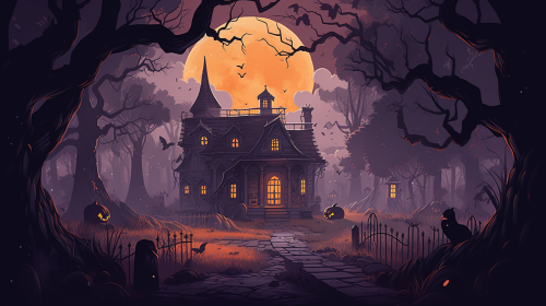 A Halloween-themed banner for a tabletop role-playing game session. Dark, misty forest under a full moon, eerie twisted trees, glowing jack-o'-lanterns on the ground. In the foreground, adventurers cautiously approach a haunted mansion with dimly lit windows. Bats flying around the moon, black, orange, and purple colors creating a spooky atmosphere. Highly detailed, atmospheric, cinematic lighting, dynamic composition --v 5.0 --ar 16:9