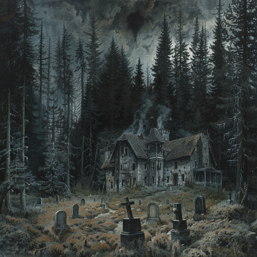 a chilling tableau of a haunted mansion nestled amidst a dense sequoia forest, its surroundings haunted by a ghost-filled cemetery, evoking an atmosphere of eerie solitude --v 6.0