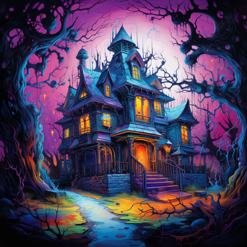 A vintage-style illustration pattern featuring a haunted mansion theme, designed to repeat seamlessly as a tile. The central motif is a series of eerie, Victorian-era mansions with gothic architecture, characterized by tall, pointed roofs, intricate ironwork, and crumbling facades. The windows of the mansions are broken, with jagged glass shards that reflect a ghostly glow. From these windows, faint silhouettes of ghosts and spectral figures emerge, their translucent forms floating through the air. Each ghost is unique, with flowing, ethereal shapes that evoke a sense of mystery and dread. Surrounding the mansions, there are gnarled, leafless trees whose twisted branches reach out like skeletal fingers. In the background, a misty night sky is depicted with a full moon partially hidden behind dark, swirling clouds, adding to the ominous atmosphere. The illustration style is reminiscent of early 20th-century horror storybook illustrations, with fine ink lines, crosshatching, and a muted color palette dominated by shades of gray, sepia, and faded blue. Occasional pops of pale yellow or eerie green glow from the ghostly apparitions and broken windows, enhancing the haunted and vintage feel. The overall composition is designed to form a continuous, repeating pattern that captures the essence of a spooky, forgotten mansion lost to time, creating a chilling yet captivating tapestry that feels like it belongs on the cover of a classic ghost storybook.