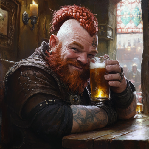 a d&d dwarf with a red Mohawk and a red braided beard. Sitting in a tavern. Smiling drinking ale. Wearing normal clothes. He is short just over four feet tall. Very broad shouldered. Long distance shot. Showing the full body from head to toes. Photo realistic.