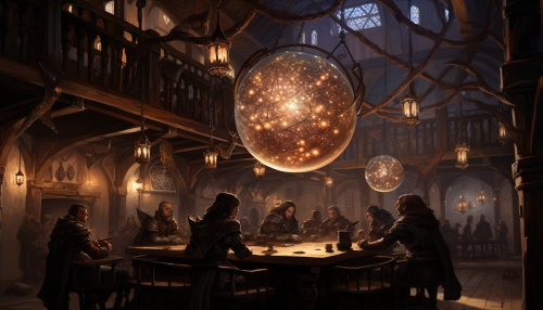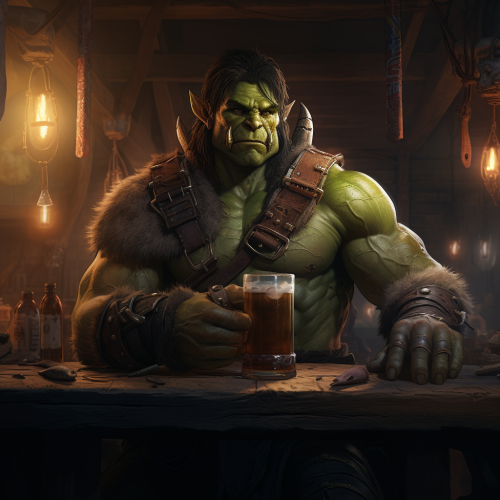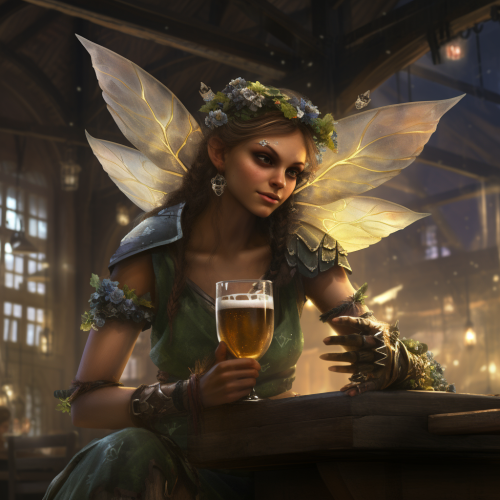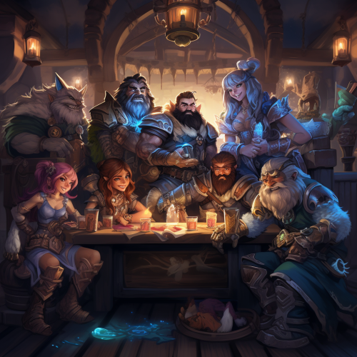 oil painting a handsom bard plays a lute in a tavern. fantasy style. Elves, gnomes, dwarves and humans sit around drinking ale and talking to each other. jovial mood --ar 24:9 --s 50 --v 5.2