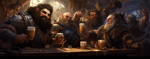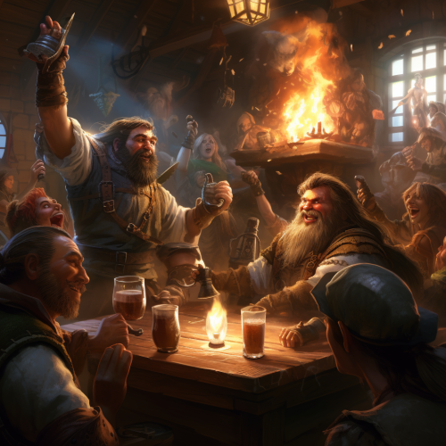 fantasy art of a lively tavern, filled with dwarves, laughing and smiling and singing, tankards of ale, dungeons and dragons, warm, trivia night