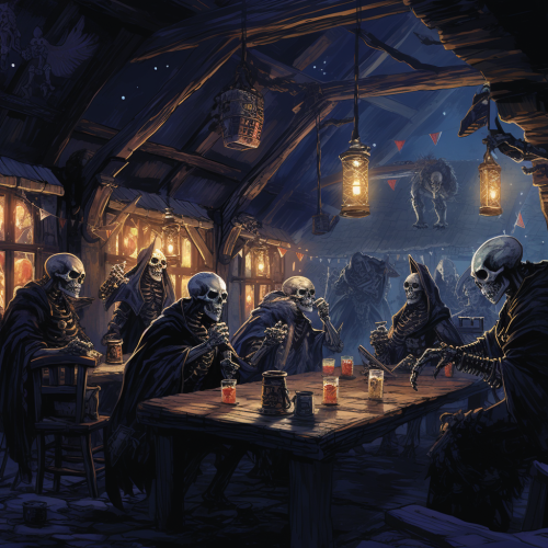 interior of a medieval tavern with skeletons instead of people, the skeletons are wearing different colored dark robes, the skeletons are drinking beer, it's snowing outside, 80s he-man cartoon style, dark fantasy