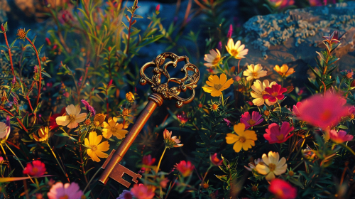 35mm film photograph of An old, ornate key partially buried in a fresh patch of colorful wildflowers, symbolizing discovery and unlocking new beginnings. photorealistic hyper realistic --ar 16:9 --v 6.0