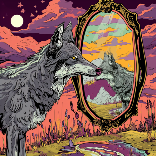 cartoon wolf discovering himself in a mirror in a moment of psychedelic existential wonder --stylize 50 --v 6.0