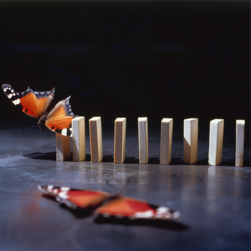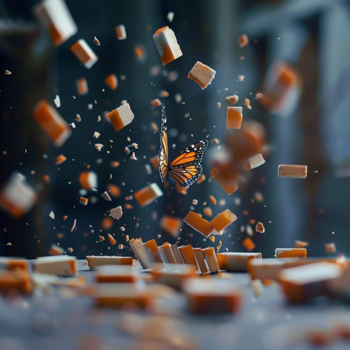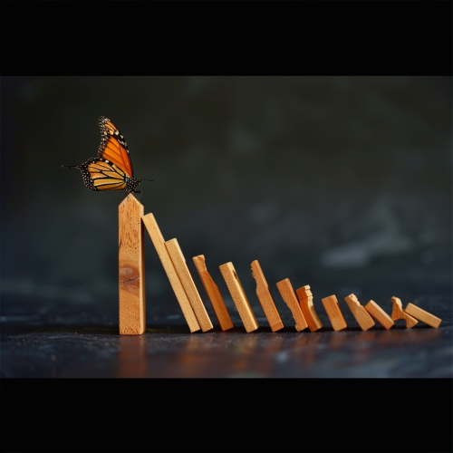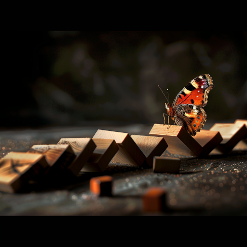 A series of dominoes falling in a cascade, with the last one transforming into a butterfly; photo essay in the style of National Geographic, chaos, award winning, sharp focus on subjects, some motion blur, 8k –ar 16:9 – v5.1 – q 2 – s750