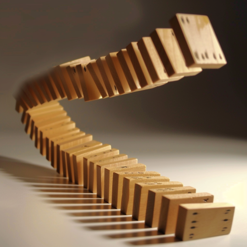A visually striking sequence of dominoes arranged in a line, with each domino progressively tipping over and falling onto the next, creating a smooth, flowing motion