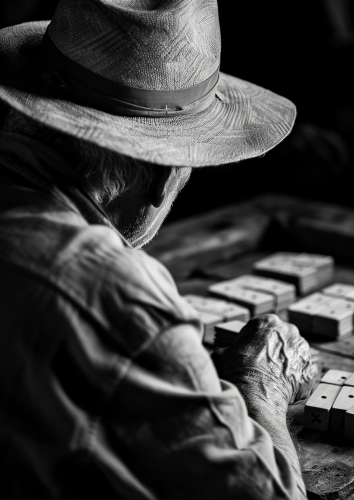 man playing domino. he is wearing a panama hat and see from behind that he has the double 6 piece in his hand --ar 5:7 --v 6.0