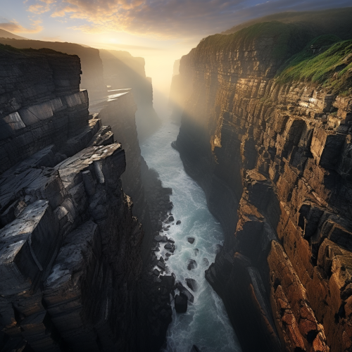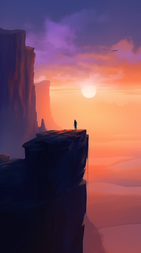 A breathtaking natural landscape featuring a towering cliff shrouded in thick mist, with an adventurer standing on the edge of the cliff, bathed in the warm glow of the setting sun. The cliff's surface is illuminated with an orange hue, creating a striking contrast against the surrounding deep blue and purple tones of the sky. In the distance, another adventurer stands on a lower platform, adding a sense of human scale and exploration. The sky is a gradient of purple and orange, indicating the time of sunset. The overall atmosphere is mystical and awe-inspiring, capturing the harmony between humans and nature. --ar 9:16 --v 5.0