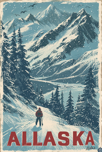 a "ALASKA" poster in the style of Tycho , advertisement poster --ar 27:40 --v 6.0
