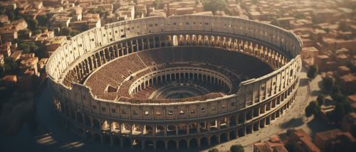 cinematic super aerial shot, a hyperrealistic Roman colosseum,cheering crowd, hyper-detailed, , a film shot in the style of Ridley Scott, grain, tilt shift, --ar 21:9