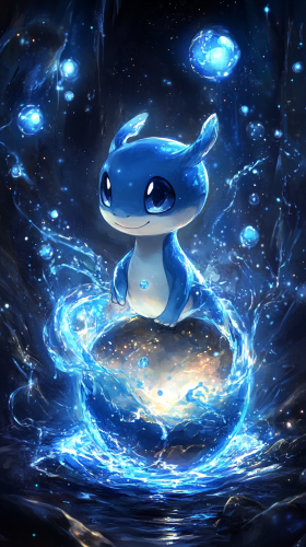 A chibi-style Dratini, with its elegant, sapphire-blue body and enchanting eyes, emerging from a cracked, glowing egg surrounded by a mystical aura. The scene is filled with a cascade of shimmering, magical light and swirling stardust, creating an ethereal atmosphere. Dratini is surrounded by floating, luminous orbs and sparkling energy currents, enhancing its magical and majestic presence. The dramatic lighting highlights Dratini's emergence in an epic, mesmerizing way, in 8K, HDR, high quality, ultra-realistic details --ar 9:16