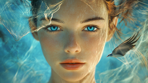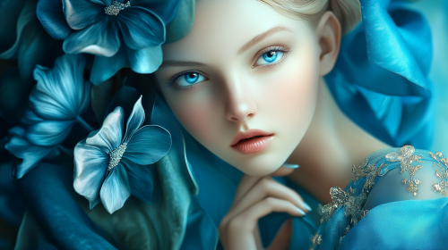 The girl has blue eyes, graceful figure, slender legs and is dressed in blue, thoughts like birds, enchanting realms, light gold and light azure, skillfully sculpted, serene faces. Styled by , Salvador Dali, --ar 16:9
