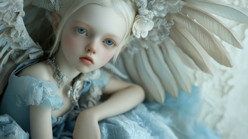 The girl has blue eyes, graceful figure, slender legs and is dressed in blue, thoughts like birds, enchanting realms, light gold and light azure, skillfully sculpted, serene faces. Styled by Nicoletta Ceccoli --ar 16:9