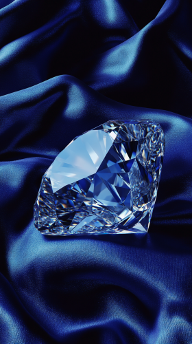 Generate a digital art for A large, sparkling diamond resting on a plush velvet cushion on the left side of the screen. The background is textured with a deep, rich blue (#0A84FF) resembling luxurious silk, creating a contrast between the vibrant blue and the shimmering facets of the diamond. A subtle shadow falls across part of the silk surface below the diamond, adding depth to the scene. The atmosphere conveys elements of elegance and opulence. . --ar 9:16
