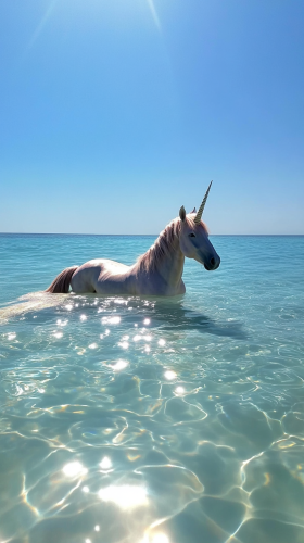 A majestic unicorn with a flowing tail, on the crystal-clear waters of a calm ocean. The sky is a vibrant blue. The sun shines softly, casting shimmering backlight and reflections on the water's surface. The unicorn horn sparkling in the sunlight. phone shot --style raw --ar 9:16
