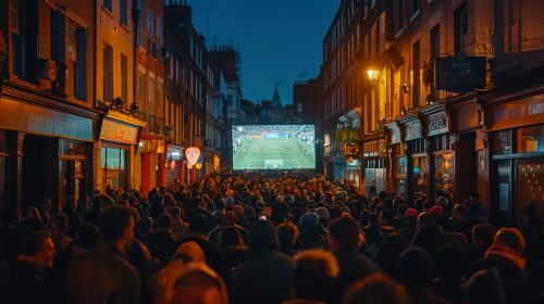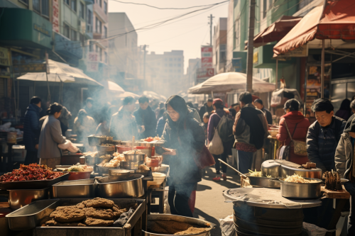 a crowded Street scene at a weekly local street market in the Irish-Chinese community of San Francisco, we see peaople eating bangers and spring rolls. street market photography, Hasselblad X2D, muted colors smokey scene 12k, bright sunny day --ar 3:2 --v 5.2