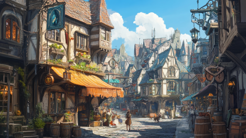 streetview of rennaisance fantasy city working-class district, storefronts, cargo, crowded, painted fantasy environment art style of pathfinder, dnd, Cat --ar 16:9