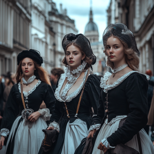 3 diverse maid girls in black and white uniform, walking busy through crowded London street, in 18th-century, 8k, long shot, side view, HDR, high resolution, shot on IMAX Laser, intricate details