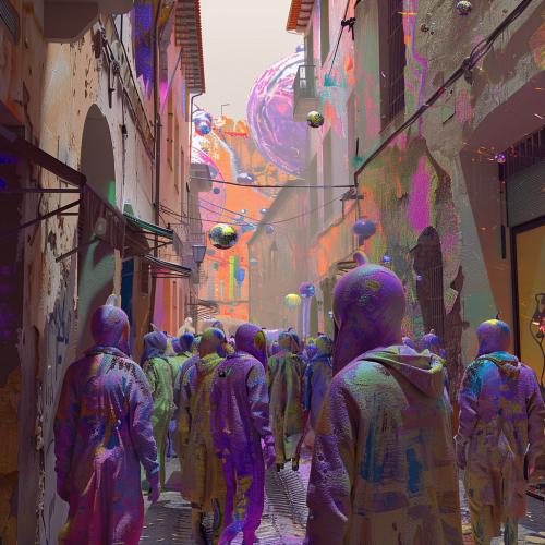 a crowded street in an alien planet in witch everyone is made of colored paint