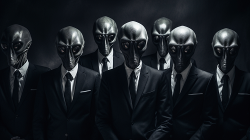 group of aliens in suit half human, dystopian,cyberpunk, wide shot, in the style of Stanley kubrick's space odyssey, cyberpunk, hyperrealism, cinematic --ar 16:9