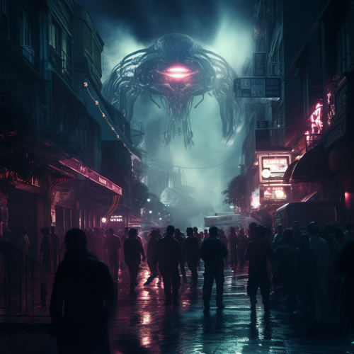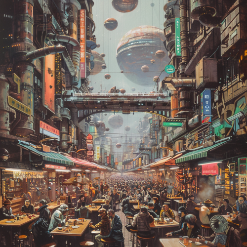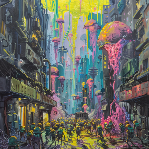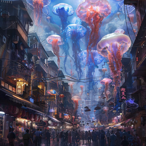 a crowded street in an alien planet. in the sky we see jellyfish of all colors. realistic picture, hyperdetailed