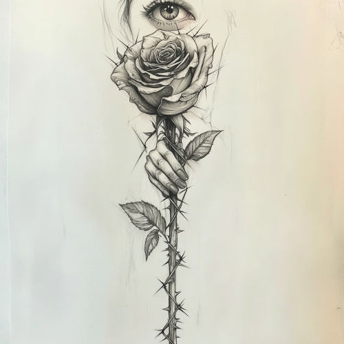 pencil sketch, for a tattoo idea of a rose with a long stem with a barb wire wrapping around the rose and a woman’s hand holding the rose with a woman’s eye above the rose