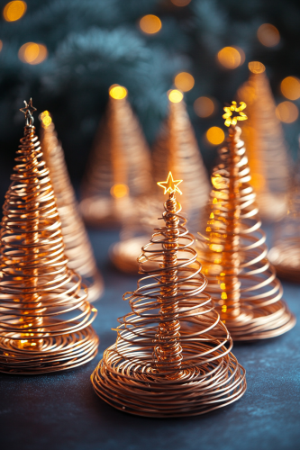 Photograph an artistic display of Copper Wire Mini Christmas Trees, each shaped from flexible copper wire and adorned with minimal decorations. This modern take on small Christmas tree ideas should highlight the sleek lines and metallic sheen of the wire, creating a contemporary and stylish holiday accent. The trees should be displayed against a dark background to enhance the copper's warm glow. Ensure the photograph is hyper-realistic and neatly composed, drawing viewers to the elegant simplicity of wire art in holiday decorating. Camera: DSLR - Canon EOS 5D Mark IV. Lens: Canon EF 24-70mm f/2.8L II USM. Composition: Wide shot, room-centered, horizontal orientation, balance between furniture and space. Film: Digital, high resolution, color profile sRGB. Camera settings: ISO 400, f/2.8, 1/60 sec. --ar 2:3 --v 6.1 --s 250