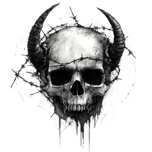 Tenebrous skull with worn-out horns and surrounded with a barbed wire, grunge style art,black and grey tattoo style, amazing detail, white background, clean background --v 6.1