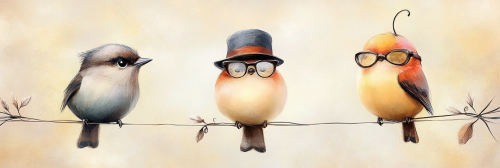 Cartoon style, painting of funny birds with glasses and hat on a wire, beige background, serenity and harmony, encaustic, unreal engine, striking, no group, gorgeous --ar 3:1 --personalize rwtb1vc --v 6.1
