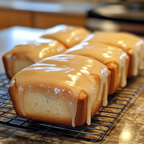 Create a close-up image of three freshly baked, rectangular mini loaves cooling on a wire rack. Each loaf is covered in a thick, glossy vanilla glaze that drips slightly over the edges, giving a warm, homemade feel. The glaze should show small specks of vanilla bean for added texture and flavor detail. The background captures the cozy atmosphere of a kitchen counter, with a softly blurred setting to keep focus on the golden-brown loaves and their smooth, shiny glaze
